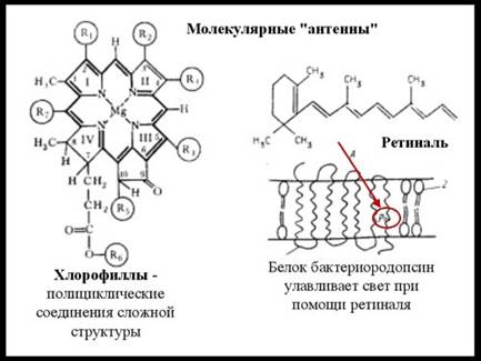 Фотоантенной у цианобактерий и высших растений служат хлорофиллы. Это сложные полициклические соединения с наличием сопряженных связей.