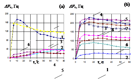 (tween-40, β-аланин) (рис. 2а), отмечена высокая скорость десорбции. С пленок других полярных и среднеполярных модификаторов скорость самопроизвольной десорбции значительно ниже (рис. 2б). Высокая скорость самопроизвольной десорбции после достижения максимального аналитического сигнала характерна также для системы масляная кислота – β-аланин (рис. 2а). Для других ароматобразующих соединений после достижения максимального аналитического сигнала отклик пьезосенсора изменяется незначительно (рис. 2).