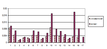 Рис. 3. Содержание аминокислот в ультрафильтрате и экстракте из листьев стевии: аргинин (1), лизин (2), тирозин (3), фенилаланин (4), гистидин (5), лейцин (6), изолейцин (7), метионин (8), валин (9), пролин (10), треонин (11), серин (12), аланин (13), глицин (14), глутаминовая кислота (15), аспарагиновая кислота (16), цистин (17).