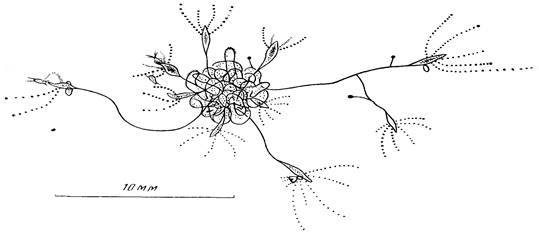 Одновременно в колонии продолжается отпочковывание латеральных почек и рост из них дочерних колоний, которые вскоре переплетаются друг с другом, образуя настоящий клубок (рис. 4). Такая ассоциация колоний может быть полезной в их существовании. Обычно наиболее крупные гидранты вытягиваются из “клубка” на 1—1,5 см, что позволяет “клубку” контролировать площадь примерно в 3—7 см2. Гидрант, поймавший добычу, часто подтягивается благодаря сжатию ножки в направлении к “клубку”. Это приводит к тому, что крупная жертва становится добычей по крайней мере нескольких гидрантов из “клубка”. Такая поддержка должна быть жизненно важной для молодых гидрантов, малые размеры которых значительно уменьшают вероятность поимки ими добычи и сокращают продолжительность безболезненного голодания в отсутствие пищи. Кроме того, запутываясь в “клубке”, гидрант таким способом прикрепляется к нему, поэтому “клубок” для некоторых гидрантов является также субстратом.