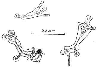Первые медузоидные почки появляются часто сразу после достижения полипом взрослых размеров, т. е. начиная примерно с 13 сут развития. Начальные размеры этих почек, шаровидных по форме, возникающих среди щупалец, 0,07 мм в диаметре. С самого начала они отличаются от латеральных почек не только своим местоположением, но также цветом (они прозрачны) и формой—у них сразу образуется ножка (рис. 1, 10). По-видимому, пища не может непосредственно поступать в медузоидную почку, так как никогда не приходилось видеть ее желтой или оранжевой, т. е. окрашенной в цвет пищи.