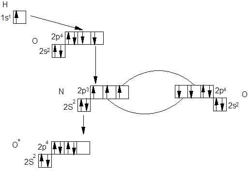 Рассмотрим строение азотной кислоты с позиции метода валентных связей. Для этого посмотрим, какие орбитали принимают участие в образовании молекулы этой кислоты.