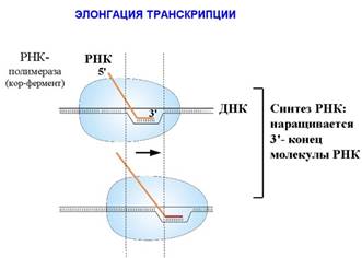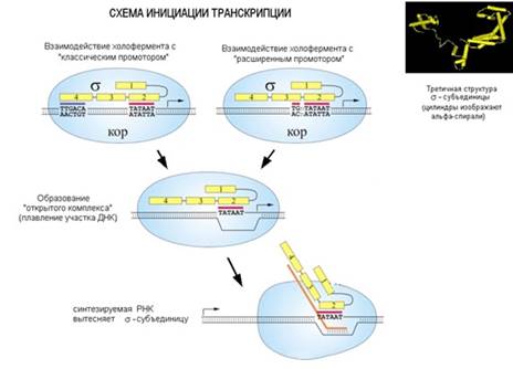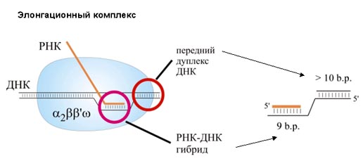 Связавшись с ДНК, а именно с промотором, который распознала σ-субъединица, холофермент расплетает двунитевую спираль и начинает синтез РНК. Участок расплетенной ДНК – это точка инициации транскрипции, первый нуклеотид, к которому должен комплементарно быть присоединен рибонуклеотид. Инициируется транскрипция, σ-субъединица уходит, а кор-фермент продолжает элонгацию цепи РНК. Затем происходит терминация, кор-фермент освобождается и становится готов к новому циклу синтеза.