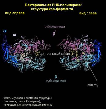 Разберем более подробно молекулярную структуру кор-фермента. Как было сказано выше, кор-фермент состоит из α- и β-субъединиц. Они соединены так, что образуют как бы «пасть» или «клешню». α-субъединицы находятся в основании этой «клешни», и выполняют структурную функцию. С ДНК и РНК они, по-видимому, не взаимодействуют. ω-субъединица – небольшой белок, который также выполняет структурную функцию. Основная часть работы приходится на долю β- и β΄-субъединиц. На рисунке β΄-субъединица показана наверху, а β-субъединица - внизу.