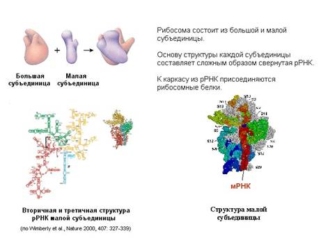 Белки в рибосоме держатся на каркасе, состоящем из рибосомной РНК. Формирование рибосомы начинается с того, что рибосомная РНК сворачивается и на нее в определенном порядке начинают налипать белки. На рисунке представлена рибосомная РНК. В ней самокомплементарные участки нити РНК спариваются, образуя шпильки (вторичная структура), и затем РНК сворачивается (третичная структура РНК), образуя каркас субчастиц.