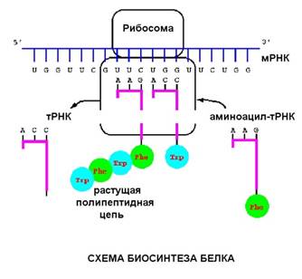 Еще один вид РНК, участвующей в синтезе белка, это транспортная РНК (тРНК). Молекулы тРНК относительно небольшие (по сравнению с рибосомногй или матричной РНК). Все тРНК имеют общую вторичную структуру. За счет спаривания комплементарных участков молекулы тРНК образуется три "стебля" с петлями на концах и один "стебель", образованный 5'- и 3'-концами молекулы тРНК (иногда образуется еще дополнительная пятая петля). Изображение этой структуры похоже на крест или клеверный лист. "Голова" на этом листе представлена антикодонной петлей, здесь находится антикодо – те три нуклеотида, которые комплементарно взаимодействуют с кодоном в мРНК. Противоположный антикодонной петле стебель, образованный концами молекулы, называется акцепторным стеблем – сюда присоединяется соответствующая аминокислота. Распознают подходящие друг другу тРНК и аминокислоты специальные ферменты, называемые аминоацил-тРНК синтетазами. Для каждой аминокислоты есть своя аминоацил-тРНК синтетаза.