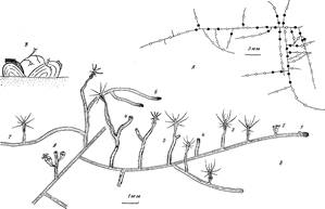 Рис. 1.А—пример карты колонии средней величины. Линии — гидрориза, белые кружки—функционирующие гидранты, черные—рассосавшиеся гидранты; Б—фрагмент колонии, иллюстрирующий жизненный цикл гидранта. 1 — верхушка столона с зачатком будущего гидранта, 2—формирующийся гидрант, 3—сформированные гидранты на ножках разной длины, соответствующих возрасту гидранта, 4—стволы побегов с верхушками на месте рассосавшихся гидрантов, 5 — побеги с гидрантами второй генерации и зачатками новых гидрантов, 6 — побег со столоповидными ветвями, 7 — ветвь, прикрепившаяся к субстрату и ставшая столоном, 8 — побег с двумя спороса-ками на разных стадиях развития (гидрант рассосался); В—предполагаемое значение неправильного ветвления с образованием столоповидных побегов: “побег — мост” позволяет осваивать новые субстраты