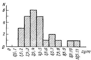 Рис. 3. Вариационный ряд продолжительности жизненного цикла гидрантов в колонии. Всего рассмотрено 26 случаев. По оси ординат — число гидрантов (N} с данной продолжительностью жизненного цикла, по оси абсцисс — продолжительность жизненного цикла (сут). Объяснения в тексте