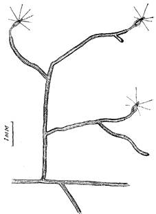Однако с каждым новым ветвлением боковая ветвь растет все дольше, прежде чем формирует гидрант на своей верхушке. Поэтому уже после третьего и тем более четвертого ветвления вместо боковой ветви образуется фактически висячий столон. Его верхушка легко прилипает к любому твердому субстрату, после чего растет, формируя настоящий столон. Вторая примитивная черта побегов в том, что часто после очередного рассасывания гидрант не возобновляется и, следовательно, эта ветвь прбега перестает расти. В результате дочерняя ветвь может обогнать материнскую. Получается примитивно моноподиальный побег с кривыми ветвями разной длины, расположенными слабоупорядочепно (рис. 4). Получить колонии с такими побегами удавалось при культивировании гидроида в течение нескольких месяцев в неподвижной воде. Несмотря на малое число междоузлий, побеги оказываются довольно протяженными—до 1—2 см. Они не способны вертикально возвышаться над субстратом.