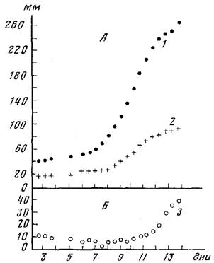 Рис. 6. Увеличение длины гидроризы (1), числа , функциони рующих гидрантов (2) и рассосавшихся гидрантов (3) у одной колонии во время эксперимента с пропорциональным кормлением (февраль 1982 г.). По оси абсцисс—дни, по оси ординат: A — длина гидроризы (мм) и число функционирующих гидрантов; Б—число рассосавшихся гидрантов