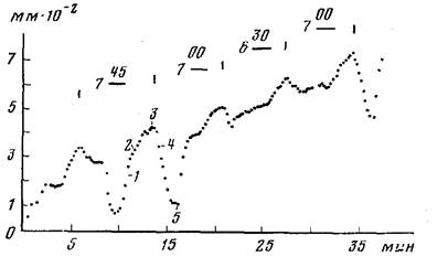 Рис. 7. Пример характерных пульсаций верхушки столона. Регистрация по апикальной части верхушки через 24 ч после кормления колонии. Температура воды 21,5° С. По оси абсцисс—время, мин; по оси ординат—длина, мм-10-2. Объяснения в тексте