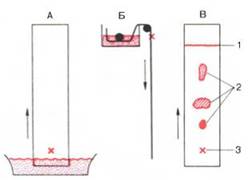 А – восходящая хроматография; Б – нисходящая хроматография (вид сбоку); В – хроматограмма с разделенными и окрашенными веществами: 1 – фронт растворителя, 2 – разделенные вещества, 3 – место нанесения образца.