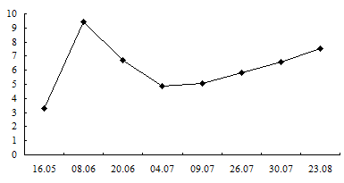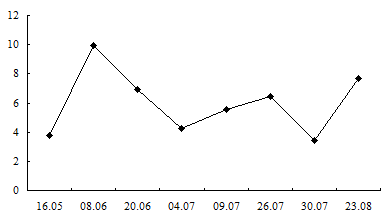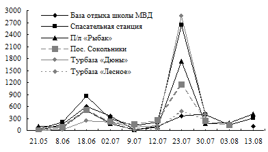 Кроме того, была изучена динамика коли-индекса воды Балтийского моря и Куршского залива как санитарно-эпидемиологического показателя. Так, за весенне-летний период в исследуемых районах максимальное значение коли-индекса было выявлено в июле и составило 2 862 в районе туристической базы «Дюны» на побережье Балтийского моря (рис. 1) и 4 000 в районе дома отдыха Госбанка побережья Куршского залива (рис. 2). Таким образом, величина коли-индекса (КИ) не превышала санитарную норму (5 000). Сезонное изменение численности бактериопланктона, отмеченное в июле и совпадающее с максимальной температурой воды, связано с увеличением поступления органики в воду моря и залива.
