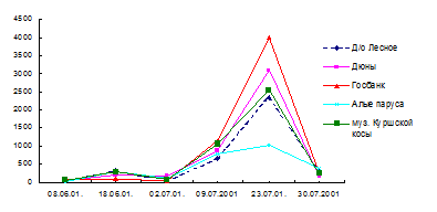 Пробы воды отбирались в шести точках прибрежной зоны Балтийского моря (в районе пионерского лагеря «Рыбак», поселка Сокольники, спасательной станции, туристических баз «Лесное» и «Дюны», базы отдыха школы МВД) и пяти точках прибрежной зоны Куршского залива (в районе дома отдыха Госбанка, туристических баз «Дюны» и «Лесное», музея Куршской косы, пионерского лагеря «Алые паруса») на протяжении весенне-летнего периода 2001 года. Отбор, хранение, транспортировка и дальнейшее исследование проб воды производились в соответствии с общепринятыми методическими указаниями по санитарно-микробиологическому анализу воды поверхностных водоемов [2]. В качестве основного показателя степени фекального загрязнения воды определяли лактозоположительные кишечные палочки (ЛКП), к которым относят грамотрицательные, не образующие спор палочки. Число ЛКП (в одном литре воды определяли методом мембранных фильтров [2]. Определяли наличие сапрофитных, условно-патогенных микроорганизмов, способных образовывать на питательном агаре данного состава колонии, видимые при увеличении в два раза. Биологическую потребность кислорода определяли стандартным методом [3].