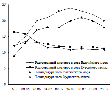 Отмечено, что значения гидрохимических показателей pH, растворенного кислорода, БПК, температуры были выше в исследуемых пробах воды Куршского залива, чем в пробах воды Балтийского моря. Величина показателей температуры и растворенного кислорода уменьшалась от марта к августу. Выявлена обратная корреляционная зависимость коли-индекса и концентрации ионов водорода в пробах воды обеих экосистем. Эту зависимость можно объяснить тем, что с уменьшением концентрации водородных ионов уменьшается количество микроорганизмов, так как для их развития необходима благоприятная слабощелочная среда, где pH = 7,2 – 7,6. В данном случае речь идет об индикаторных микроорганизмах, по наличию которых судят о загрязнении объектов водной среды [4].