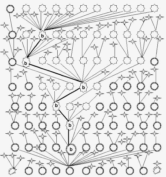Предлагаемая схема вытеснения вида-предка видом-потомком объясняет оба эти аргумента. Эволюция гоминид протекает «скачкообразно» – от одного вида к другому, между которыми имеют место быть не промежуточные виды, а промежуточные популяции. Причем, прямая и неразрывная генетическая связь, отражающая постепенное накопление признаков, рождающих, в конечном счете, новый вид, присуща только особям базовых популяций (на схеме - «b»), число особей в которых могло быть буквально несколько десятков. Поэтому вероятность того, что когда-нибудь мы сможем отыскать останки этих особей, пожалуй, равна нулю.