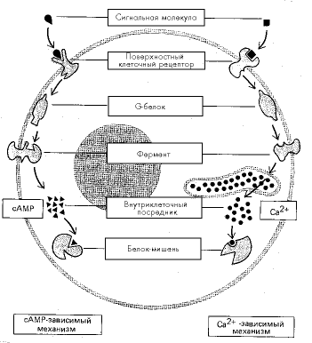 Число разнообразных сигналов, которые клетка может получать извне, очень велико. Это слабые электрические импульсы, гормоны, медиаторы, различные ростовые факторы и другие воздействия. Количество же вторичных мессенджеров, с помощью которых все это множество внешних сигналов влияет на внутриклеточные процессы, удивительно мало. Это цАМФ, ионы кальция, специальные молекулы типа высокофосфорилированных нуклеотидов (РРАРР – фосфат-фосфат-аденин-фосфат-фосфат) или инозитолтрифосфат.