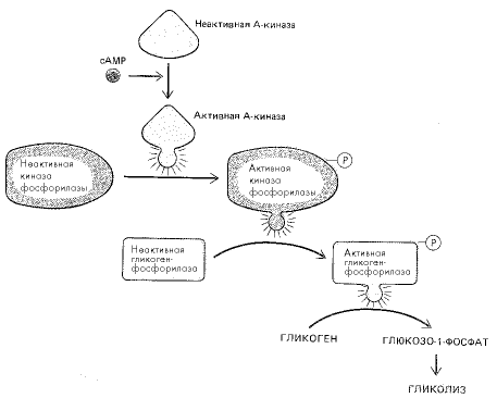 Рис. 3. Схема стимулирования распада гликогена повышением уровня цАМФ
