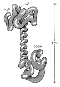 Как же такое простое вещество, как ион кальция, может регулировать активность белков? Выяснилось, что он связывается внутри клетки со специальным белком кальмодулином (рис. 11). Этот достаточно крупный белок, состоящий из 148 аминокислотных остатков, как и цАМФ, обнаружен практически во всех изученных клетках.