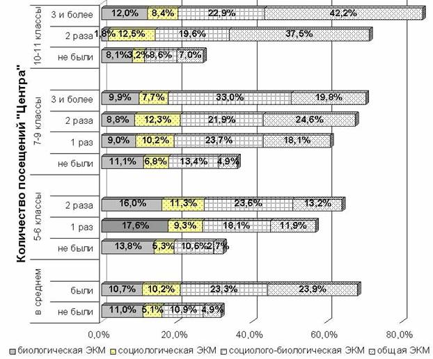 При дифференцированном анализе по группам классов, обращает на себя внимание высокая доля процента школьников со сформированной общей ЭКМ и близких к ней по целостности ЭКМ социологической и биологической, проявившихся вместе, у тех, кто посещал занятия в «Центре», возрастающая по мере старшинства и усвоения программ «Центра». На основе базисных школьных программ ЭКМ у школьников Москвы формируется лишь у 27-36%, и их число не увеличивается с возрастом по мере освоения новых предметов биологического цикла — в старших классах их меньше всего (рис.1).