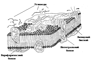 Основным компонентом мембранных органоидов является мембрана. Биологические мембраны построены по общему принципу, но химический состав мембран разных органоидов различен. Все клеточные мембраны – это тонкие пленки (толщиной 7–10 нм), основу которых составляет двойной слой липидов (бислой), расположенных так, что заряженные гидрофильные части молекул соприкасаются со средой, а гидрофобные остатки жирных кислот каждого монослоя направлены внутрь мембраны и соприкасаются друг с другом (рис. 3). В бислой липидов встроены молекулы белков (интегральные белки мембраны) таким образом, что гидрофобные части молекулы белка соприкасаются с жирнокислотными остатками молекул липидов, а гидрофильные части экспонированы в окружающую среду. Кроме этого часть растворимых (немембранных белков) соединяется с мембраной в основном за счет ионных взаимодействий (периферические белки мембраны). Ко многим белкам и липидам в составе мембран присоединены также углеводные фрагменты. Таким образом, биологические мембраны – это липидные пленки, в которые встроены интегральные белки.