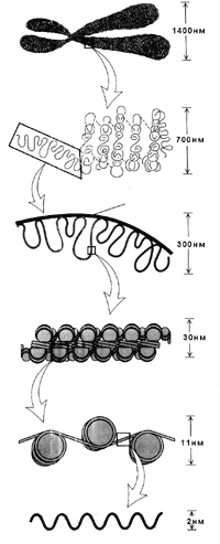 Сначала двойная нить ДНК закручивается вокруг отдельных блоков гистонов, в каждый из которых входит 8 молекул белка, образуя структуру в виде «бусин на нитке» толщиной около 10 нм. Бусины называются нуклеосомами. В результате формирования нуклеосом длина молекулы ДНК уменьшается примерно в 7 раз. Далее нить с нуклеосомами сворачивается, формируя структуру в виде каната толщиной около 30 нм. Затем такой канат, изогнутый в виде петель, прикрепляется к белкам, образующим основу хромосомы. В результате образуется структура с толщиной около 300 нм. Дальнейшая конденсация этой структуры приводит к образованию хромосомы.