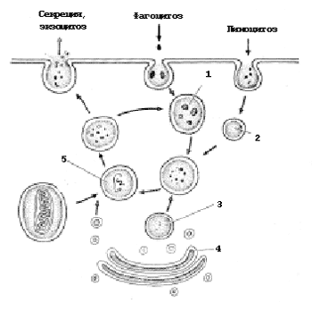 Рис. 11. Образование и функции лизосом: 1 – фагосома; 2 – пиноцитозный пузырек; 3 – первичная лизосома; 4 – аппарат Гольджи; 5 – вторичная лизосома