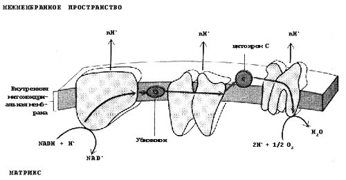 Митохондрии окружены двумя мембранами: наружной, отделяющей митохондрию от гиалоплазмы, и внутренней, отграничивающей ее внутреннее содержимое. Между ними располагается межмембранное пространство шириной 10–20 нм. Внутренняя мембрана образует многочисленные выросты (кристы). В этой мембране располагаются ферменты, обеспечивающие окисление образовавшихся за пределами митохондрий аминокислот, сахаров, глицерина и жирных кислот (цикл Кребса) и осуществляющие перенос электронов в дыхательной цепи (схема). За счет переноса электронов по дыхательной цепи с высокого на более низкий энергетический уровень часть освобождающейся свободной энергии запасается в виде АТФ – универсальной энергетической валюты клетки. Таким образом, основная функция митохондрий – это окисление различных субстратов и синтез молекул АТФ.
