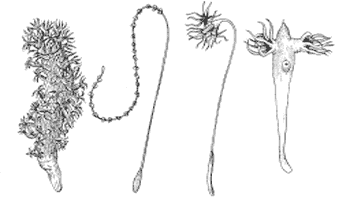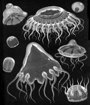 Среди этих морских «светлячков» очень много представителей типа кишечнополостных (Сoelenterata). Особенно часто светятся гидроидные и сцифоидные медузы. Некоторые из них живут на глубинах от 1 до 6 км в царстве вечного мрака и холода, в условиях высокого давления. Зонтики этих обитателей абиссали имеют толстую хрящевую мезоглею, поэтому глубоководные медузы плавают очень медленно. Встречаются и такие, как гидромедуза меатор (Meator rubator), которая и вовсе утратила типичную для медуз куполообразную форму – она превратилась в прозрачный студенистый шарик с темной сердцевиной.