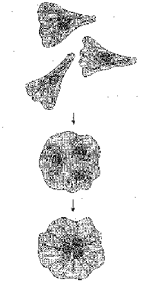 Недавно наша группа исследователей показала, что, обрабатывая большую дисковидную многоядерную клетку эпителия особым белком, выделяемым в организме некоторыми тканями (так называемым рассеивающим фактором), можно вызвать разделение этой клетки на несколько самостоятельно ползающих участков, связанных друг с другом шнурами цитоплазмы, не способными активно двигаться (рис. 5).
