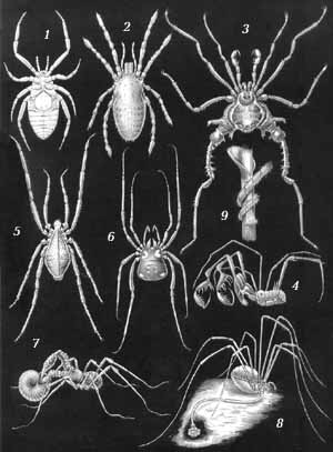 Сенокосцы: 1 – ископаемый карбоновый сенокосец; 2 – примитивный сенокосец рода Siro; 3 – Gonyleptus curvipes; 4 – Obidosus amplochelis; 5 – Trogulus aquaticus; 6 – Nemastoma quadripunctata; 7 – Ischyropsalis helwigi, поедающий моллюска; 8 – Lioobunum rotundum, самка, откладывающая яйца в почву; 9 – лапка сенокосца, обвившая стебель злака