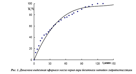 Набор этих параметров является определяющим при идентификации и сертификации фармакопейного сырья [4, 7-10]. Изучение динамики выделения эфирного масла показало, что процесс выделения растянут во времени, протекает с изменяющейся скоростью и заканчивается за 130-180 минут (рис. 1).