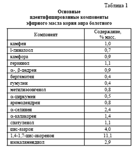 Установлено, что эфирное масло корня аира болотного содержит около 100 индивидуальных компонентов, 25 из которых имеют содержание более 1%. Основные идентифицированные компоненты представлены в табл. 1.