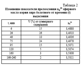 Учитывая сложный состав образующегося эфирного масла, можно предположить, что его состав будет изменяться по мере выделения. Подтверждением этому является изменение показателя преломления