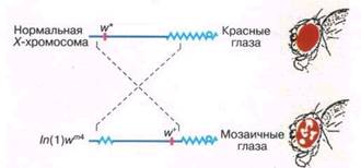 Одним из удивительных свойств гетерохроматина является его способность передавать компактизованное состояние на эухроматиновые фрагменты хромосом, перенесенные в его соседство с помощью хромосомных перестроек (рис. 2). Гены в перенесенном фрагменте инактивируются, хотя и не во всех клетках одного и того же органа. Например, если ген w+ у дрозофилы, обеспечивающий нормальный красный цвет глаз у мухи, переносится с помощью инверсии In ( l ) wm 4 в новое положение - в окружение прицентромерного гетерохроматина, в части клеток он инактивируется. В результате на фоне нормально окрашенных участков глаза будут появляться пятна из неокрашенных белых клеток, в которых ген w+ инактивирован - образуется как бы мозаика из окрашенных и неокрашенных клеток (см. рис. 2). Это явление; называемое эффектом положения мозаичного типа, в настоящее время изучают весьма интенсивно, поскольку исследователи полагают, что оно является удобной моделью для понимания генетического контроля механизмов компактизации - декомпактизации хроматина.