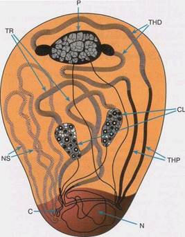 Рис. 3. Общий вид ядра спермотоцита у самца Drosofilia hydei (из [1], с.62). TR , P , THD , CL , THP , NS – названия петель, С – центромера, N - ядрышко