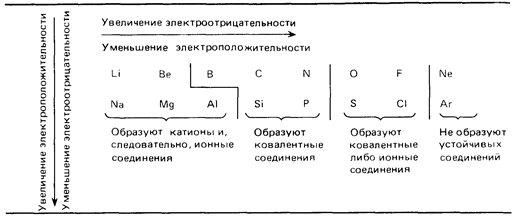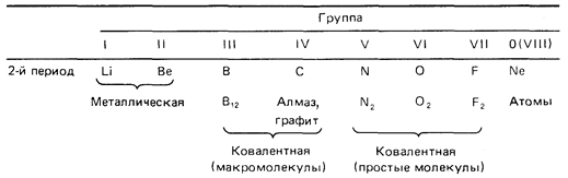 При перемещении слева направо вдоль периода металлические свойства элементов становятся все менее ярко выраженными. При перемещении сверху вниз в пределах одной группы элементы, наоборот, обнаруживают все более ярко выраженные металлические свойства. Элементы, расположенные в средней части коротких периодов (2-й и 3-й периоды), как правило, имеют каркасную ковалентнуто структуру, а элементы из правой части этих периодов существуют в виде простых ковалентных молекул.