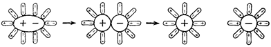 Механизм электролитической диссоциации — распада молекул или кристаллов растворяемого вещества на ионы под влиянием молекул растворителя — был понят несколько позднее. Согласно современным воззрениям, такой распад является результатом взаимодействия полярных молекул растворителя, например воды, с молекулами или кристаллической решеткой растворяемого вещества. Молекулы растворителя атакуют кристаллическую решетку, разрушая ее и переводя составные части решетки (ионы) в раствор в форме сольватированных (гидратированных) заряженных частиц Окружающие эти ионы полярные молекулы растворителя ориентированы в соответствии с зарядом ионов. Растворение электролита в известной мере упорядочивает молекулы растворителя. Естественно предположить, что эта способность к упорядочению молекул растворителя у многозарядных ионов выражена сильнее, чем у однозарядных. В этом и нужно искать причину того, что соли, содержащие многозарядные ионы, плохо растворимы (в ряде случаев практически нерастворимы) в воде. Например, хлорид бария растворим хорошо, а сульфат бария — очень плохо. Следовательно, влияние растворенного вещества и растворителя является обоюдным: полярные молекулы растворителя разрушают кристаллическую решетку растворяемого вещества на отдельные ионы, а эти ионы, переходя в раствор, вызывают изменение растворителя, заставляя его молекулы упорядочиваться. Кроме того, сольватированные ионы растворенного вещества не индифферентны по отношению друг к другу. Противоположно заряженные ионы имеют тенденцию притягиваться силами электростатического взаимодействия, образуя нейтральные молекулы или нейтральные группы молекул. Разумеется, в реальном растворе всегда присутствуют как отдельные сольватированные ионы, так и нейтральные молекулы.
