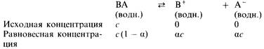 Допустим, что при растворении электролита ВА в воде образуется раствор, имеющий концентрацию с. В результате некоторая часть а электролита ВА диссоциирует, образуя ионы B+ и А– . Величина a называется степенью диссоциации . Равновесная концентрация неионизированного электролита ВА оказывается равной с(1– a). Таким образом, можно записать