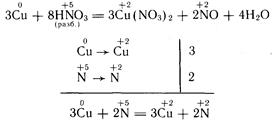 Эти реакции, в сущности, тоже представляют собой реакции замещения. В качестве примера приведем реакцию между медью и азотной кислотой. Медь вытесняет водород из кислоты. При этом происходит окисление меди, которая превращается в гидратированный катион, а содержащиеся в растворе кислоты гидратированные протоны азота восстанавливаются, образуя оксид азота.