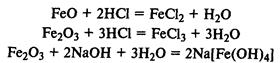 Соединения железа. FeО — основной оксид, реагирует с растворами кислот с образованием солей железа (II). Fe2 О3 — амфотерный оксид, реагирует также с рас творами щелочей.