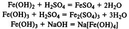 Гидроксиды железа. Fe(ОН)2 — типичный основной оксид, Fe(ОН)3 обладает амфотерными свойствами, реагирует не только с кислотами, но и с концентрированными растворами щелочей.