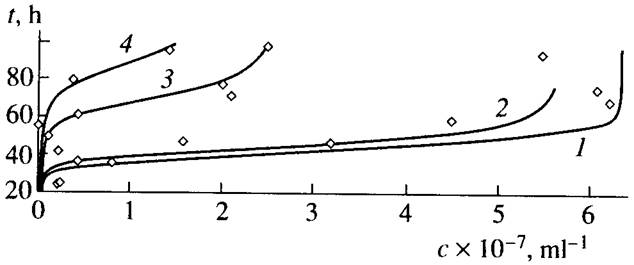 Рис.1. Экспериментальные точки и графики функции (16), описывающие рост пивных дрожжей при разных концентрациях (ммоль/л) солей хрома и никеля [13]: (1) c(Ni) = c(Cr) = 0.0, (2) c(Ni) = 0.5, (3) c(Cr) = 0.5, and (4) c(Ni) + c(Cr) = 0.5 + 0.5. Коэффициенты: a=1.25.10-7 мл /ч, b=0.8ч-1 , р=0.32 ч-1 , f =2.