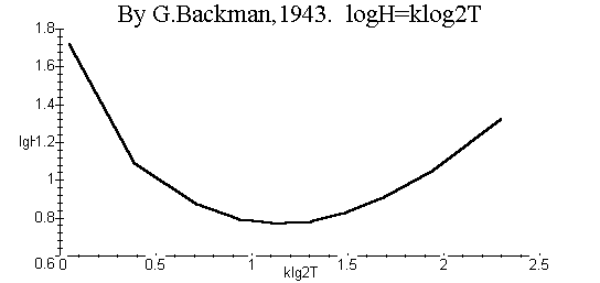 В аналитическом виде функцию Бакмана можно получить, подставляя в (25) выражения H и T, равные, соответственно, правым частям уравнений (14) (при w1 =0) и (16). При этом получают зависимость (25) как явную функцию роста, выражаемого переменной величиной c1 при заданном начальном значении c0 . На рис. 4 приведен соответствующий график. Согласно (25), логарифм скорости роста должен быть пропорционален квадрату логарифма времени роста. Однако, как следует из рис. 4, такая зависимость для двухстадийной популяции не наблюдается.