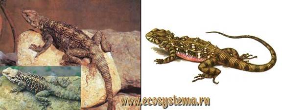 1 — гималайская агама (Laudakia himalayana), 2 — кавказская агама, 3 — хорасанская агама (Laudakia erythrogastra), 4 — туркестанская агама (Laudakia lehmanni) и 5 — степная агама (Trapelus sanguinolentus)