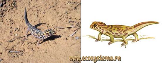 Местообитания. Сцинковый геккон живет, как правило, в песчаной пустыне на голых и закрепленных песках со скудной растительностью. Изредка его отмечали на прилегающих к пескам плотным грунтам, на плакорах и такырах. Плотность этого геккона в Казахстане колеблется от 1, 0 до 16, 6 особи на 1 га, а в Туркменистане — от 3 до 13 особей на 1 км маршрута.