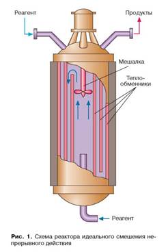 Вторая важная характеристика такого реактора — эффективность смешения. В промышленности существуют различные методы смешения реагентов и перемешивания реакционной смеси. Чаще всего для этих целей используют вращающиеся мешалки различной конфигурации. Каждый реактор со своим перемешивающим устройством можно охарактеризовать некоторым средним временем смешения τсм. Измерить τсм можно следующим образом. В какое-то место реактора вводится окрашенное вещество (индикатор). Затем, отбирая пробы в разных точках, определяют, за какое время весь объем реактора станет равномерно окрашенным. Реактор идеального смешения — это такой реактор, в котором выполняется условие