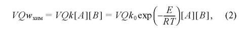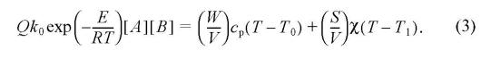 где V — объем реактора, Q — теплота реакции, ωхим — скорость реакции, k — константа скорости, k0 и Е — предэкспоненциальный множитель и энергия активации, [A] и [B] — концентрации реагентов. Выражение для скорости реакции записано в предположении бимолекулярного процесса A + B → C. Тепло расходуется на нагрев исходных реагентов от начальной температуры T0 до температуры T в реакторе. Скорость расхода тепла на нагрев равна Wcр(T - T0), где cр — средняя теплоемкость реакционной массы. Кроме того, часть тепла отводится из реактора через стенки к теплоносителю со скоростью Sχ(T - T1), где χ — коэффициент теплопередачи через стенку, T1 — температура теплоносителя. Приравнивая приход и расход тепла и разделив на V, имеем