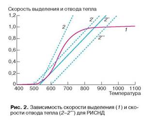 На рис. 2 представлены схематически левая (рис. 2, 1) и правая (рис. 2, 2) части уравнения (3). Точки пересечения — решения уравнения (3), то есть значения температур в стационарных условиях. В принципе могут существовать два устойчивых режима, соответствующие нижней и верхней точкам пересечения кривой 1 и прямой 2. Третья средняя точка пересечения, если она существует, отвечает неустойчивому состоянию. При эффективном теплоотводе или большой скорости подачи реагентов прямая 2 имеет большой угол наклона к горизонтальной оси и существует единственная точка пересечения. В этом случае работа реактора совершенно устойчива при различных температурах T0 и T1. Если прямая 2 касается кривой 1, то реактор может устойчиво работать только при высоких температурах. Если теплоотвод через стенки отсутствует и все тепло реакции идет на нагрев реакционной смеси (χ = 0), то такой режим работы РИСНД называется автотермическим.