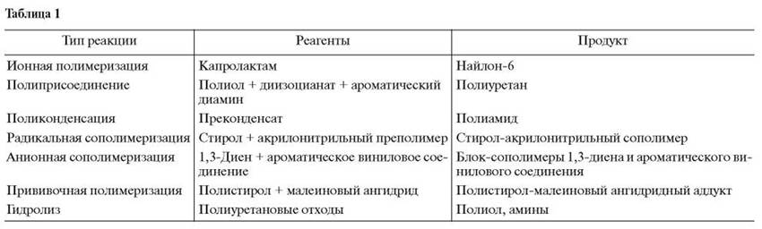 Было установлено, что следующие типы реакций могут быть проведены в экструдере: 1) радикальная, анионная, катионная и координационная полимеризация; 2) поликонденсация, полиприсоединение; 3) направленная деструкция и сшивание полимеров с целью получения продукта с необходимым молекулярно-массовым распределением и образованием реакционных групп для последующей прививочной и других реакций; 4) образование функциональных групп на полимере; 5) модификация полимеров путем прививки мономеров или смеси мономеров на основную полимерную цепь с применением радикальных инициаторов или ионизирующего излучения; 6) межцепные реакции с получением сополимеров; 7) реакции полимера и полифункциональных агентов с получением разветвленных полимеров; 8) получение термоэластопластов методом динамической вулканизации; 9) измельчение полимерных отходов, резин и пр.